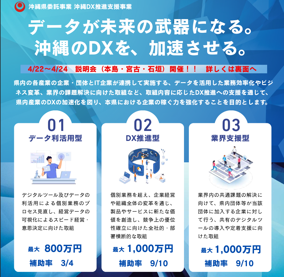 ISCO では、県外企業と県内企業とのマッチングをサポートしております。 この企業を紹介して欲しいと言うようなご要望や、自分たちと協業して頂 けそうなパートナー候補企業探し、沖縄で開催されているイベントや 県内企業との親睦を深める交流会等の情報提供などご要望に添えるよう サポートしております。