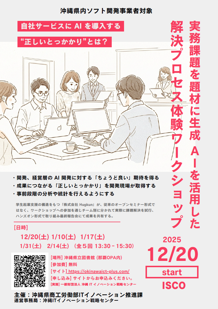 このたびISCO内ICTビジネス高度化支援事業において、沖縄県内ソフト開発事業者を対象に、実務課題を題材に生成AIを活用した「解決プロセス体験ワークショップ」を全5回シリーズで開催いたします。